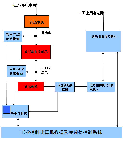 • 電力測功機; • 計算機測量控制系統(tǒng); • 轉(zhuǎn)速扭矩傳感器; • 電流電壓傳感器; • 鑄鐵平臺; • 測功機變頻控制柜; • 彈性聯(lián)軸器; • 被測電機安裝支架。